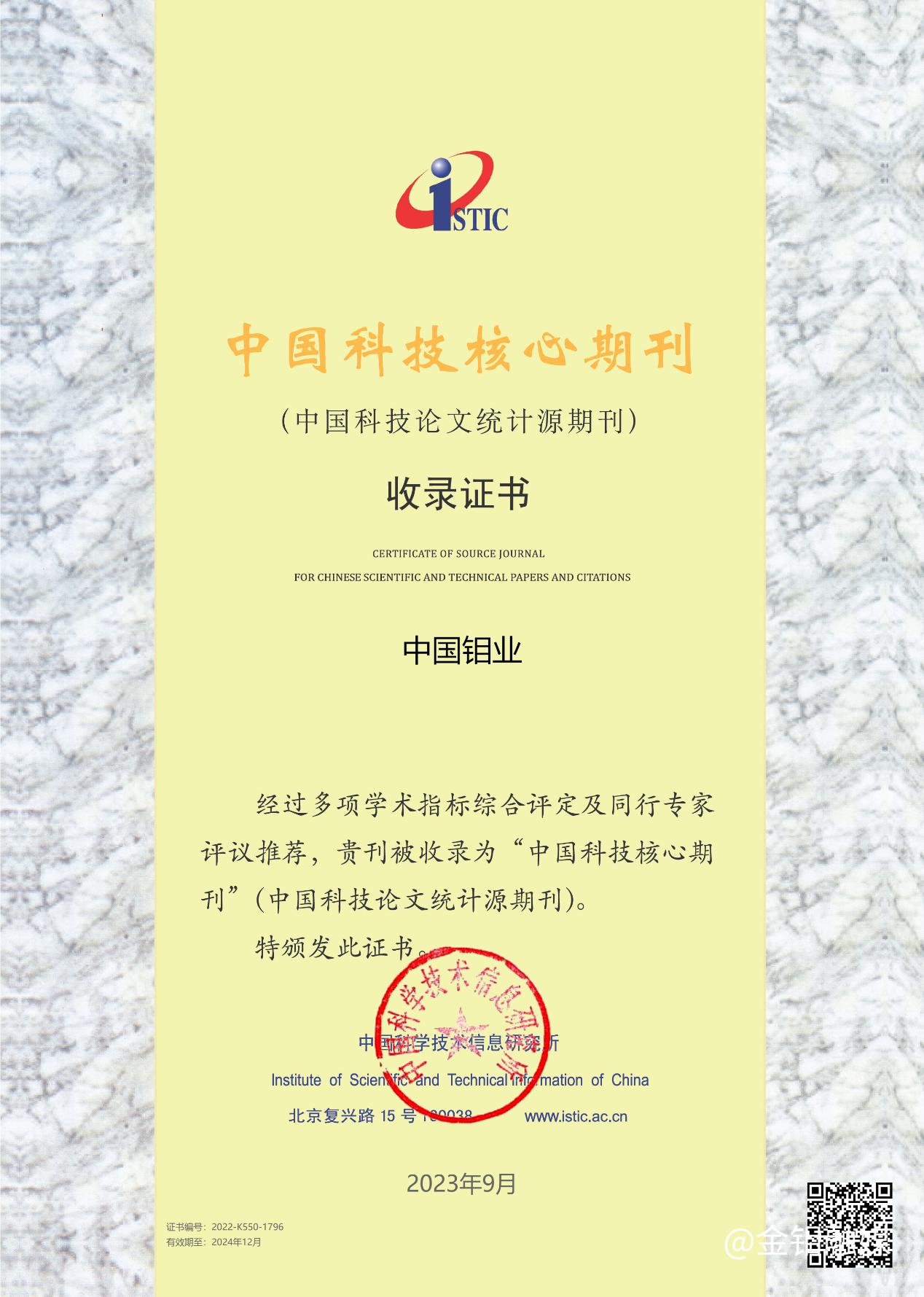 9月20日,由中國科學(xué)技術(shù)信息研究所主辦的“中國科技論文統(tǒng)計(jì)結(jié)果發(fā)布會——暨中國一流科技論文世界影響力評價(jià)論壇會議”在北京召開,《中國鉬業(yè)》繼續(xù)入選“中國科技核心期刊”。這是自2011年以來,《中國鉬業(yè)》連續(xù)12年被收錄為“中國科技核心期刊”。