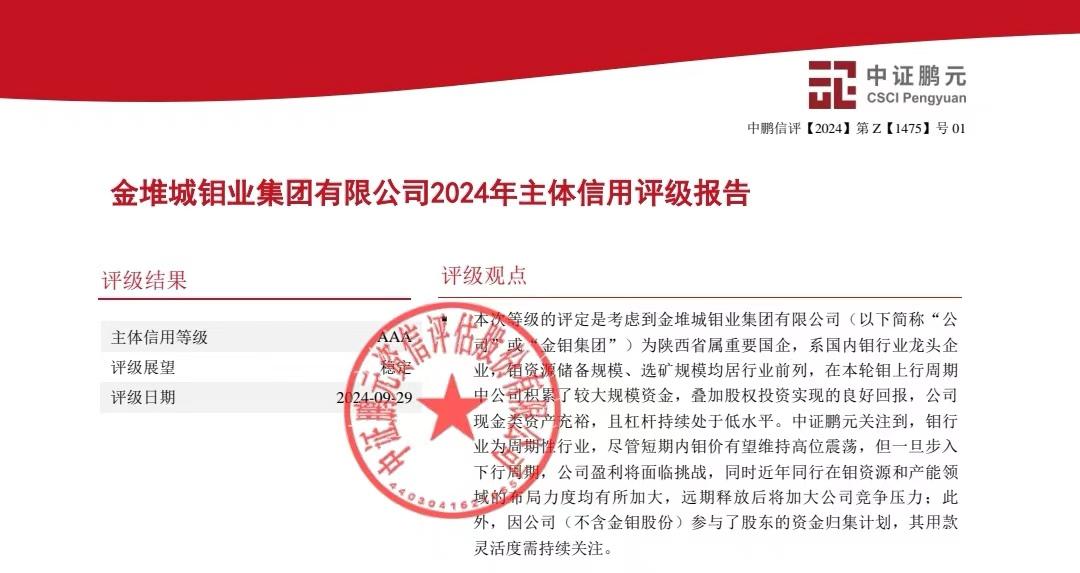 為進(jìn)一步提高金鉬集團(tuán)在資本市場(chǎng)的認(rèn)可度,拓寬融資渠道、降低融資成本。近日,經(jīng)中介機(jī)構(gòu)盡職調(diào)查、跟蹤分析和審慎評(píng)估,出具正式報(bào)告,評(píng)定金鉬集團(tuán)主體信用等級(jí)為“AAA”。