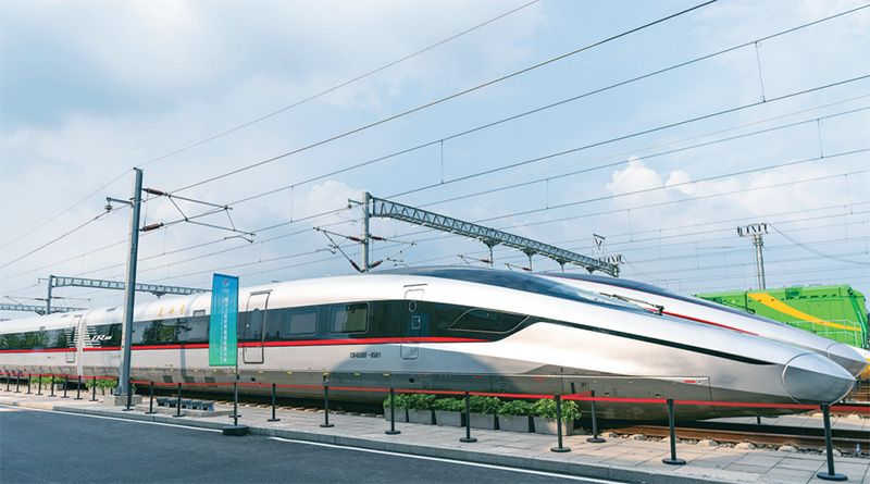 “十四五”時(shí)期,以CR450動(dòng)車組為代表的一項(xiàng)項(xiàng)重大技術(shù)裝備項(xiàng)目取得新進(jìn)展、實(shí)現(xiàn)新突破。CR450動(dòng)車組試驗(yàn)速度可達(dá)450公里/小時(shí),運(yùn)營(yíng)速度可達(dá)400公里/小時(shí),是全球跑得最快的高鐵。圖為2025年7月9日,在國(guó)家鐵道試驗(yàn)中心展區(qū)拍攝的CR450BF動(dòng)車組。 新華社記者 才揚(yáng) 攝